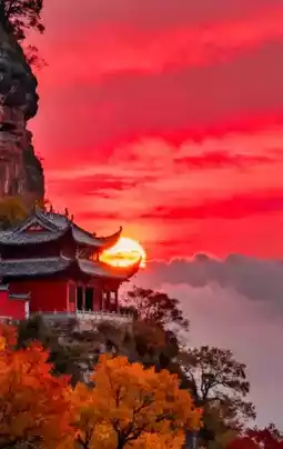 The cliff inscription "Heaven Opens Divine Beauty" still exudes immortal aura; inside the red rock cave lie the relics of Taoist monks’ pure cultivation, and the red cliff glows like blazing flames in the sunset.