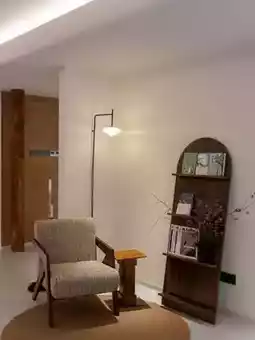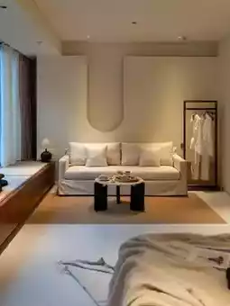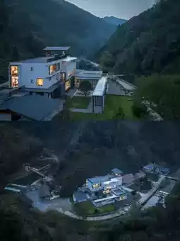The B&B is backed by green mountains and faces the stream. It was designed by a professional B&B design team. The overall building is mainly white, with some parts in dark gray. The appearance is simple and elegant, and it is fresh and natural against the backdrop of natural green. The decoration is based on the current popular Wabi-Sabi style, which is simple, elegant and fashionable.
