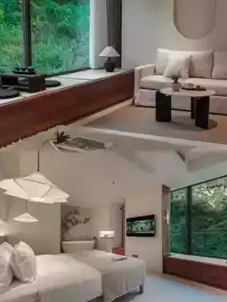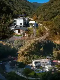 The homestay is hidden in a bamboo forest halfway up the mountain, with a white and dark gray color scheme that’s simple, elegant, and perfectly blends with the surrounding greenery! The interior features a wabi-sabi style—minimalist yet relaxing, every photo you take looks amazing. Lying in bed, you can watch the mountain mist flow through the huge floor-to-ceiling windows, instantly cutting your work fatigue in half!