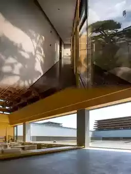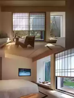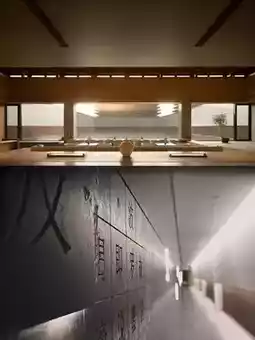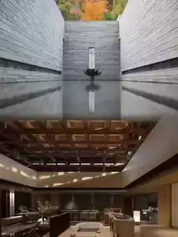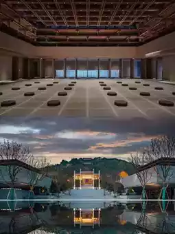 The hotel is built in a square shape using mortise and tenon joints, with a wooden roof and stone walls, showcasing the beauty of Chinese architecture. It features a cultural exhibition area, courtyard water features, a popular lobby bar, a Zen tea room, and a sound therapy room. The lobby is decorated in natural wood tones, with light and water features, Zen screens, and bamboo and linen elements, creating a classical garden-like atmosphere. The guest room area is connected by a corridor and stone bridge, with a wooden roof and courtyard landscaping adding to the poetic atmosphere.