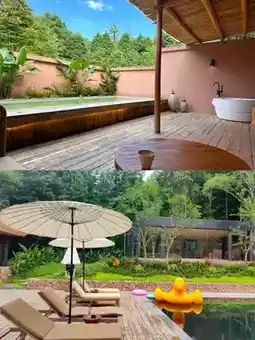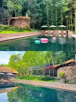 The outdoor pool is breathtakingly beautiful! Swimming in the cool water surrounded by greenery is pure bliss. The private hot spring area in the treehouse creates the perfect atmosphere - soaking in the evening while sitting by a bonfire makes all fatigue instantly vanish. There's also a gym, large lawn, horse ranch, and options for camping and barbecue - the recreational activities are diverse and plentiful...