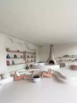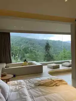 Natural wood + rattan elements paired with huge floor-to-ceiling windows,