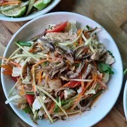 "Madam Yok Krok" is a popular som tam restaurant in Yala Province. For those who enjoy the bold and unique flavors of som tam, the restaurant also offers a wide variety of other interesting dishes, including Isaan and other Thai dishes. Known for its delicious flavors and friendly atmosphere, this restaurant is a favorite among locals and tourists alike. They offer a wide variety of som tam, grilled chicken, larb, nam tok, and more. If you prefer your som tam spicy, you can request it from the staff.