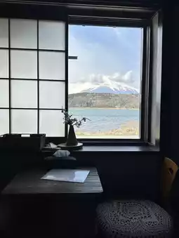 Tatami mats, a coffee table, and a window seat overlooking the lake and mountains make time seem to slow down.