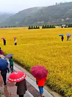Walking along the thousand-mu rice field ridges in Nanniwan, visitors finally experience what Chairman Mao said: "Joyfully watching the waves of rippling grain!" Their spirits surge like the waves!