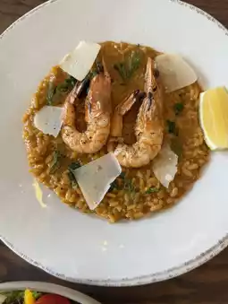 🦐 Bisque Risotto – Rich rice with lobster soup and bouncy shrimps. Served with 4 pieces.
