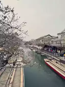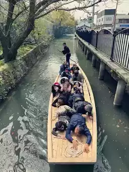 On the boat, we passed through low gates, listening to the boatman's witty remarks, feeling particularly joyful. The shimmering water reflected the surrounding cherry blossoms, making the entire scenery even more gentle and dreamy. As the boat moved along, we also saw many traditional local buildings. The white-walled, black-tiled houses, set against the cherry blossom trees, seemed to take us through a tunnel of time, allowing us to feel the ancient charm.