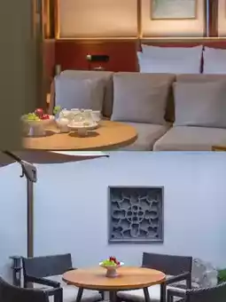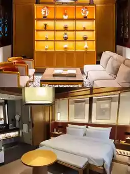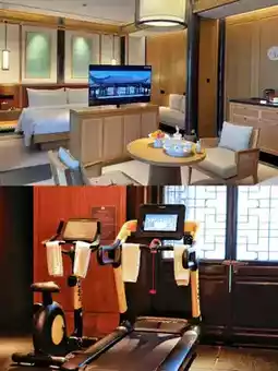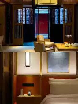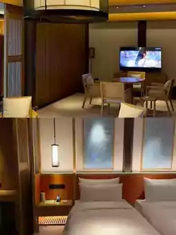 Upon entering, you’ll find a living room, with the bedroom on one side and the bathroom on the other. The room also features underfloor heating 🔥, making it super cozy to lie down after a hot spring soak 😌. The blend of classical Chinese elegance and modern smart furniture is seamless 👍. The wooden beam-style ceiling adds a very classical touch.
