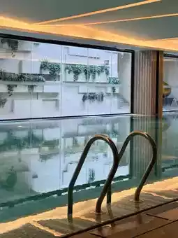 The hotel is located beside the picturesque Dayang Bay, not far from Nanyang Airport. In the evening, traveling from Yancheng Station to the hotel, you can still see the sunset. The hotel overall adopts a garden style with white walls and black tiles. Two Luohan pines stand on either side of the lobby, with glazed golden fragments cascading from the ceiling. The lobby bar offers a happy hour in the evening, and the grand piano and huge teddy bear attract attention. The gym on the same floor has anaerobic separation, and the heated swimming pool is paired with a hot spring pool, making the facilities impeccable.