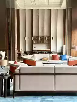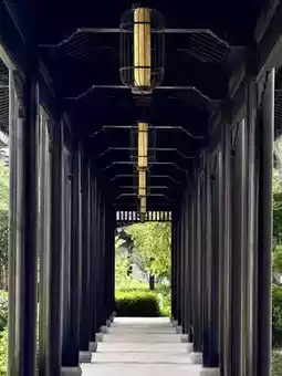 Walking to the outdoor garden, the breeze lifts the curtains of the four-cornered pavilion. Lotus flowers bloom on the lake spanned by a long bridge. The wedding lawn is lush and green. Black swans swim and raise their young among the pavilions and waterside terraces, with the sound of flowing water nearby. The symmetrical corridor pillars on both sides of the conference area perfectly showcase Chinese aesthetics. The layered and staggered landscape design reflects the designer’s thoughtfulness. Guests can also play badminton and basketball at the wellness center in the middle of the garden.