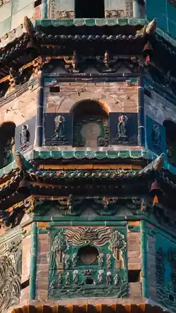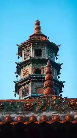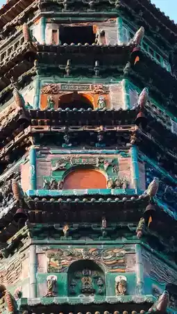 The glazed pagoda in the temple is considered a treasure. It was built in the 36th year of the Ming Dynasty. It has 10-level octagonal steps and is 27.8 meters high. The tower body uses black, yellow, purple, ink green, peacock blue and other colors of colored glaze. There are 177 glazed reliefs and more than 480 glazed statues. The most distinctive feature is that each floor has a different Buddhist story theme, including Galan Protector, Twenty-Four Heavens, Shakyamuni Dharma, Buddhist Holy Land, Eggplant Purple Glazed, Green Scripture Glazed, Taoist Thirty-Three Days Listening, Buddha Speaks Amitabha Sutra and two floors of Thousand Buddhas.