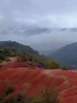 🌈The Danxia landforms at Hongshaling are breathtaking. The blood-red sandstone grains shine brilliantly under the sun, creating a striking contrast with the surrounding green vegetation.