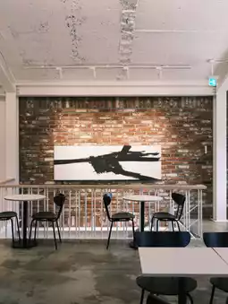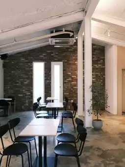 This cozy bakery cafe features warm-toned brick walls and a clean, laid-out table layout, creating a comfortable space for a relaxing stay.
