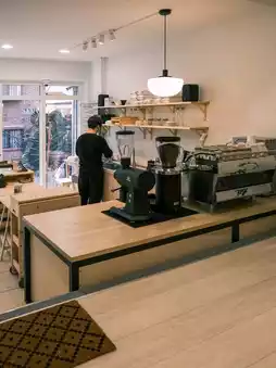 On the first floor of a red brick building, the clean and cozy white and wood interior is captivating, with a long coffee bar and a sensual duplex layout. The independent tables spaced across a small passageway add to the tranquility.