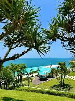 Features stunning skyline pools and cliffside swimming spots. The private beach with fine sand offers an instant vacation vibe.