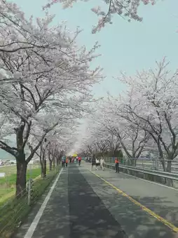 This place, where cherry blossom petals flutter in the spring breeze, is healing just by walking! ✨ Walking along the path full of blooming cherry blossoms and feeling the flower rain is the best! 🌿🌸 It's a perfect spot for taking photos, with cherry blossoms and the blue sky blending perfectly for that Instagram vibe~ 📸 At dusk, the sky turns red, making photos with the cherry blossoms even more special! 🌅💕 On weekends, a flower viewing here is a must! 🌸