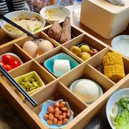 During our visit to Lijiang, the hotel we stayed provided breakfast which was beautifully presented in a nine-grid bamboo tray, with each compartment holding a variety of foods such as steamed corn, steamed buns, small apples, nuts, tomatoes and sweet potato.