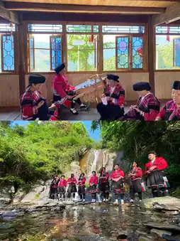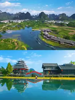 1️⃣First, visit Shangri-La Park, where farmland and village houses blend perfectly. Wander through gardens and forests while enjoying ethnic song and dance performances. Walk through the ethnic villages to experience the architectural style of northern Guilin's minorities. It feels like stepping into a fairyland, just like the Peach Blossom Spring described by Tao Yuanming.