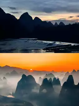 1. Choosing the Viewing Spot: I recommend two perfect spots. One is Xiangong Mountain. From the summit, you can overlook the first bend of the Lijiang River. At sunset, the afterglow paints the river surface, turning the landscape into a mesmerizing orange-red watercolor painting. The other spot is Laozhai Mountain. It's less crowded, allowing for a more tranquil sunset experience. Enjoy a 360-degree panoramic view of the sunset, with distant mountains and villages bathed in the golden light, creating a truly magical atmosphere.