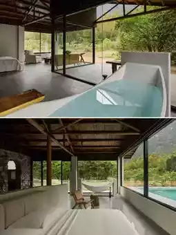 The infinity pool hangs on the mountainside, dancing with light and shadow