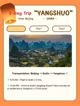 Day1️⃣: Race to Yangshuo Guanlan Hotel → Firefly night walk → 6:00 Xianggong Mountain sunrise → Hunt inkstone pebbles by Li River