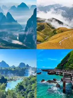 - Hundred-Mile Gallery: An 83-kilometer water route from Guilin to Yangshuo, with reflections of green peaks and clear waters winding through, featuring Nine Horses Fresco Hill and Yellow Cloth Reflection (the scene on the 20 RMB note), like a fairyland painting.