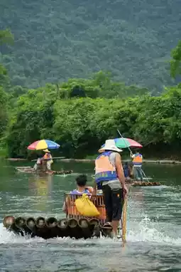 ✔ Yangshuo Bamboo Rafting: 90-minute dual bamboo raft experience from Jinlongqiao Pier (¥320). Marvel at stunning landscapes while literally floating through a painting. Includes 9 dam crossings (some thrilling) - no need for special sandals, just lift your feet.
