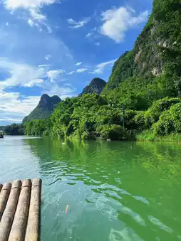 The Yulong River flows quietly through the mountains and waters of Yangshuo. The emerald peaks on both sides are reflected in the clear water, like a flowing ink painting. As morning mist lingers, bamboo rafts glide gently through the water, and water birds fly across the river, leaving light ripples. The air is filled with the fragrance of earth and grass, relaxing the mind.