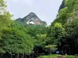 At the end of Yangshuo's Ten-Mile Gallery stands a towering peak reaching 380 meters high, seemingly carved by a divine hand with a massive tool. At its summit lies an extraordinary circular hole, a masterpiece of nature. From afar, it resembles a bright moon hanging atop the mountain, suspended in Yangshuo's sky, earning it the name 'Moon Hill.'