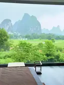 Opening the door, the first thing that amazes you is the window view—not just simple greenery, but a framed view of Yangshuo’s mountains, layered and wrapped in mist. Watch the fog roll over the hills in the morning, or wait for the sunset to dye the horizon in the evening. Lying in bed, you can embrace the gentle beauty of Guilin. The overall light luxury style is just right—not flashy but exquisitely detailed, with soft bedding and high-quality decor. It’s comfortable and stylish to stay here.