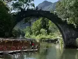 The Fuli Bridge on the Yulong River is the very end of the Yulong River... Honestly, I think the scenery along the way is better, but the shape and antique charm of the Fuli Bridge are really quite unique. The artificial bamboo rafts and the endless crowds along the way show how fascinating this tourist route is. The cafes and slogans along the way are really interesting. I also came across Zhang's Cafe, which was really interesting.