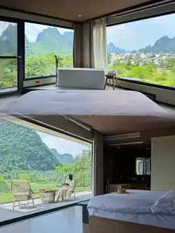 The hotel is tucked inside the Ten-Mile Gallery scenic area, and when you open the window, you see the Karst peaks⛰ Whether standing on the balcony or sitting in the courtyard, every shot looks like a landscape painting! In the early morning, you can hear the babbling water and birdsong; at dusk, watch the sunset glow spread over the village, and even the air carries the fresh scent of earth. All the city worries instantly disappear~ After rain, clouds and mist float among the mountains, it really feels like living in a fairyland!
