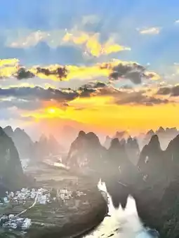 The iconic limestone karst mountains and cliffs rising dramatically around the Li River create one of China’s most famous and picturesque landscapes.
