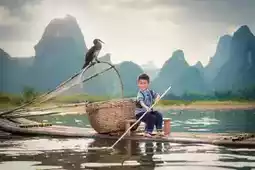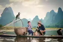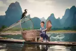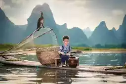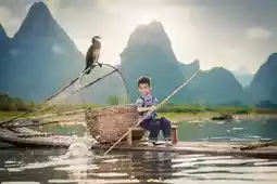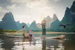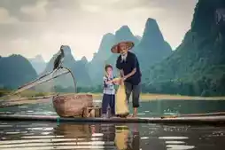 The most touching scenery is often hidden in everyday life. One evening, I happened to see a grandfather and grandson fishing on a bamboo raft on the Li River. The old fisherman wore a bamboo hat, the child was barefoot, and the reflection of green bamboo swayed on the river surface. The sunset draped a golden veil over the shimmering water. The old fisherman patiently taught the child how to bait and cast the rod, ripples spreading on the water. When the fishing rod trembled slightly, the grandfather and grandson cheered with delight together, their laughter carried far by the evening breeze—turns out happiness can be so simple and pure.