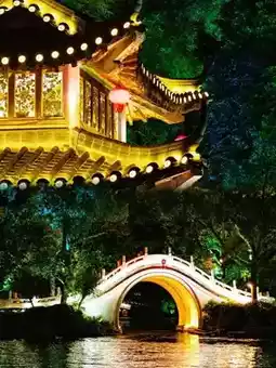 Boarding the boat at Wenchang Bridge Pier, during the 90-minute journey, the glass bridge over Taohua River sparkles like crystal, the white marble railings of Beidou Bridge emit a soft glow, as if stepping into a fairy tale world. The Sun and Moon Twin Towers at Shan Lake are the absolute highlight, with the golden Sun Tower and silver Moon Tower reflected in the lake—every photo is a hit on social media!