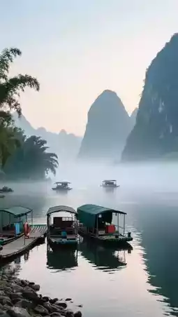4️⃣ Early morning Yangdi dock (like an ink painting)