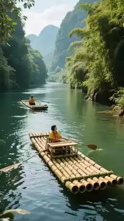3️⃣ Bamboo raft mid-route (framing with great depth)