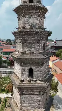 Yangling Xingguo Temple Pagoda was built in the first year of Xiande during the Later Zhou of the Five Dynasties (954 AD). This pagoda is a hexagonal nine-story hollow pavilion-style brick tower, consisting of three parts: the base, the body, and the finial. It stands about 27 meters tall, with a circumference of about 18 meters at the base. The outer bricks are polished and relatively uniform. The base is hexagonal with a waist-like shape. The body of the pagoda gradually narrows with each ascending level. The top is built with overlapping bricks forming a four-cornered pointed roof, topped with an iron gourd-shaped finial. Each level has eaves, under which large brick interlocking and corner brickwork are constructed, along with brick rafters and flying rafters. Above the eaves, there are inverted overlapping brick layers, and close to the pagoda wall, brick decorations shaped like mountain flowers and banana leaves are built. Historically, the Xingguo Temple Pagoda played the role of a feng shui tower to revitalize local culture, functioning to gather water and energy and to suppress water and evil spirits, making it an important cultural landmark locally. At the same time, the pagoda’s construction highlights the advanced ancient techniques in tower load-bearing performance and overall structural strength. This pagoda is one of the few well-preserved Song Dynasty brick pagodas in the Central Plains region and holds significant reference value for studying the development of Song Dynasty architecture and the spread of Buddhist culture. It is a nationally protected key cultural relic.