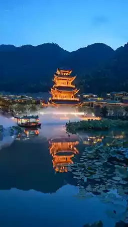 The landmark at the center of the scenic area, a three-story, four-column wooden pavilion. During the day, the lake is shrouded in mist, you can row boats and feed koi; at night, there is a stunning light show and water screen movie, the essence of Gexian Village.
