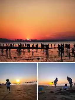 After avoiding the scorching sun, we set out to the beach to stroll (dig) in the sand. After realizing that we couldn’t walk to the Big Whale 🐳 to check in, we took a taxi to Yangfan Square to continue basking in the sun – the children had no resistance to the slides and other facilities in the square. The setting sun will fall between the buildings but it cannot block its splendor. There are many green algae on the beach but it does not affect the majestic atmosphere of the picture. At this time, you should also prepare a small bucket, because you can grab a handful of small algae.