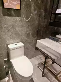 As a Gold member, I was upgraded to a sea view room. Since the hotel isn't right by the sea, you can only see the ocean from a distance. The room is just over 30 square meters, with more space allocated to the living area, so there's no bathtub in the bathroom. I really liked the long desk - very convenient for eating and working on the computer. The bathroom is surprisingly small - I almost doubted this was a DoubleTree property [JoyTears]