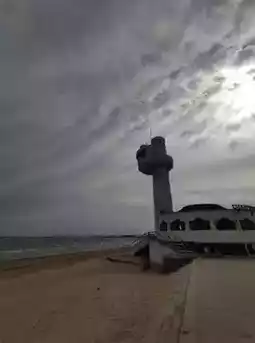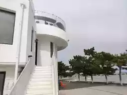 The pure white lighthouse stands quietly, gently watching over the Yellow Sea Pearl nearby