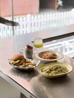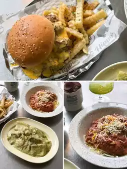 Philly cheese steak burger, basil cream paccheri, ragu pasta