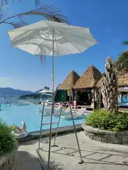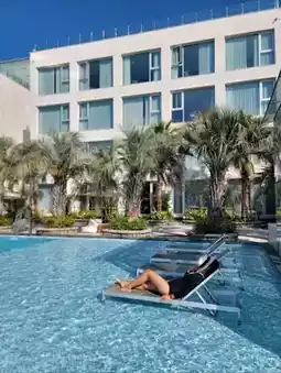 The outdoor swimming pool was absolutely amazing! Everything was so perfect that I couldn't help but fall in love with it 🥹. Not only does the exterior exude a tropical vacation vibe, but the pool is also deep enough to cater to adults who genuinely enjoy swimming, making it an ideal spot for both photo enthusiasts and water lovers. If you enjoy taking pictures and swimming, this place is truly a paradise.