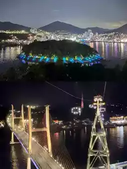 Next, hop on the Yeosu Marine Cable Car to enjoy breathtaking views of Dolsan Bridge and the sea. During the day, you'll be treated to the vibrant blue ocean, while at night, the dazzling lights create a completely different charm 🌉.