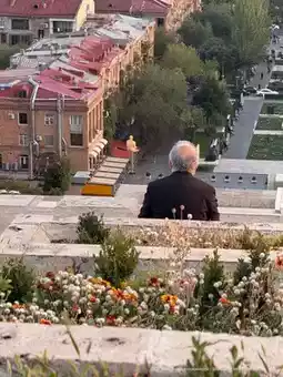 From below, the Cascade looks like a white stone amphitheater. At the top, there's a garden, fountains, and sculptures. As you climb the steps, the city gradually unfolds: rooftops, a theater dome, greenery, and, if the weather is good, Mount Ararat veiled in a light haze.