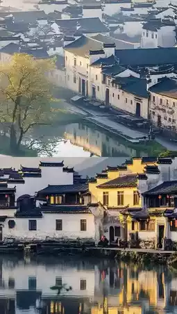 📸 **Shot 2 (Ancient Town Sculling Boat)**: Hongcun Village's Moon Pond reflects the whitewashed walls and dark gray tiles.