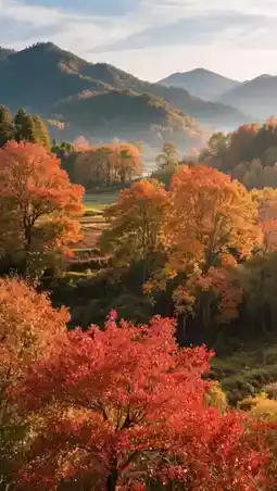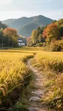 Golden waves of rice rolling, Chinese tallow trees burning red like fiery clouds, Hui-style old houses with white walls and black tiles hidden deep in the forest sea, a wisp of morning mist drifting by, as if a fairyland has descended to earth. 🌫️🍁