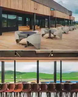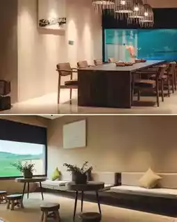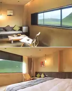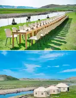 Two buildings are nestled between mountains and rivers (Building 1 faces the mountains, Building 2 overlooks the river), with open courtyards offering unobstructed views of the endless grassy sea! The clash of raw wood and rugged stone creates a wild yet luxurious texture, while the yurt restaurant and outdoor pool blend seamlessly into the valley landscape, offering 360° views of the hilly meadows! Floor-to-ceiling windows + private terraces frame the grassland, river valley, and starry sky into a 24-hour dynamic art exhibition. In the evening, warm lights twinkle like scattered stars across the grassland, echoing the Milky Way.