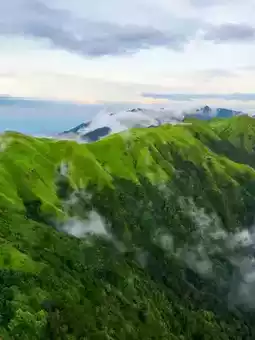 Fluffy clouds wrapped the distant mountains